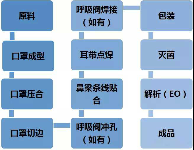 半自动的设备包括口罩成型机、口罩压合机、口罩切边机、呼吸阀冲孔机(若有呼吸阀)、鼻梁条线贴合机、耳带点焊机、呼吸阀焊接机(若有呼吸阀)、包装、灭菌、解析(EO)、成品。